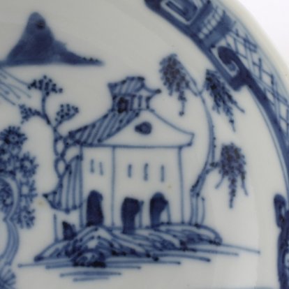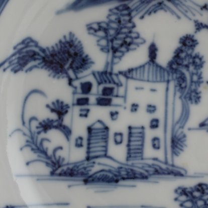 This scene is somewhat reminiscent of porcelain decorated with Burghley House, dated c.1745. Of course the Burghley example is more refined, but beside the subject of European buildings some trees with uncommon foliage are found on both. Another comparison that comes to mind when looking at the style and detailing of the buildings are some plates which were directly copied from a Dutch Delft tile, please see object: Chine de commande - Western Subjects 1680-1800 - Various Subjects - Outdoor Scenes - Object 2011671, Perhaps another Delft tile was used here?