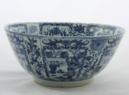 Bowl on footring, straight rim with foliated edge. Kiln sand adhering to the inner footring. Decorated in underglaze blue with a riverscape with houses, trees and figures in a central medallion surrounded by a broad floral scroll border. Both in- and outside walls are divided in six large and six narrow panels. The large panels have a floral scroll border, three are filled with Chinese figures and river scenes with houses and trees, the other three are filled with Iznik-like flowers, the narrow panels are filled with tulips and flowers. Above the footring a broad floral scroll border.