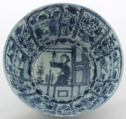 According to Rinaldi this bowl can be classified as a Shape VI.3 bowl with Transitional features (c.1635-1650). The shape and body of these bowls comply with kraak characteristics, yet their decoration has adopted features typical of the Transitional style: it is much more elaborate and stylized and includes narrative scenes with figures as well as Dutch flowers, tulips and Iznik style flowers. The centre medallions offer a very wide selection of motifs, either typically Chinese or with European influence. The broad border around the centre medallion is decorated with a variety of motifs, like simple or floral scrolls, palmettes and semicircles. Both inside and outside walls are divided in large and narrow panels from three to six each. The large panels have a border with scrolls or vegetal motifs and are usually filled with extremely stylized and thinly-drawn flowers with Iznik influence or with European houses with Chinese figures. The narrow panels are filled with tulips and thinly-drawn flowers with Iznik influence. These bowls are an exact parallel with Border IX dishes and should be dated accordingly: 1635-1650. Curiously, while there are several Border IX dishes in the Topkapi Saray, there are no bowls with Transitional features. This would indicate that the production was mainly intended for the Dutch home market where most of these bowls are still to be found today. (Rinaldi 1989, pp.163-164)