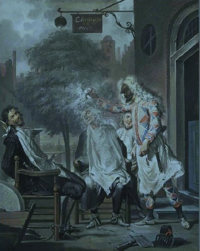 Cornelis Troost, Arlequin toovenaar en barbier, 1738, Mauritshuis, The Hague, Netherlands, inv. nr. 184. In spite of the satirical intent, the painting reflects actual usage.